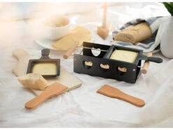 - 2 appareils à raclette avec chacun 2 bougies, 2 racleurs en bois résistants à la chaleur, 2 caquelons avec revêtement antiadhésif et mode d’emploi en français