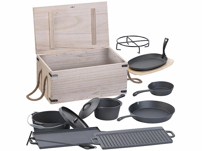 Amateurs de camping, ce produit est fait pour vous ! Avec ces 9 ustensiles en fonte, cuisinez partout, sans vous brûler ni vous frustrer. Les ustensiles peuvent être utilisés avec un four traditionnel, dans votre cheminée ou encore sur un feu de camp ! Vous pouvez même placer des braises sur le couvercle du plat pour une chaleur plus homogène.