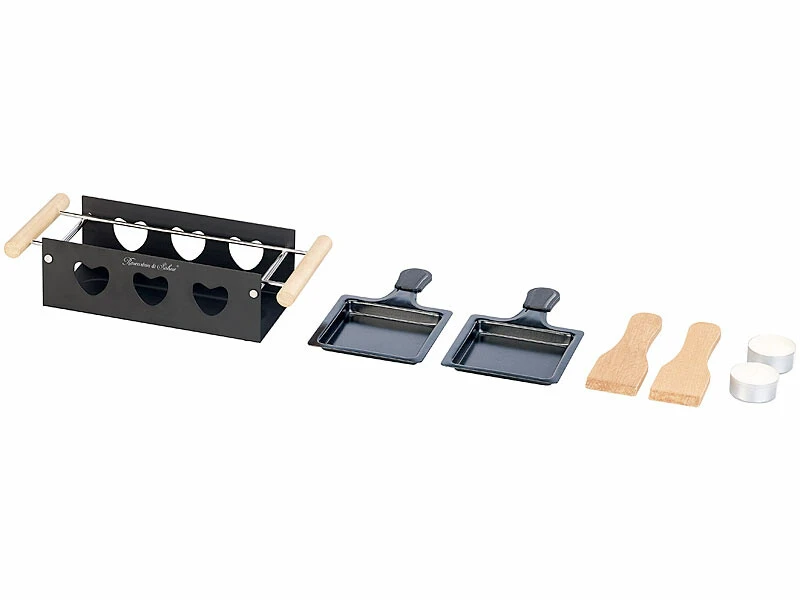 - Appareil à raclette avec 2 bougies, 2 racleurs en bois résistants à la chaleur, 2 caquelons avec revêtement antiadhésif et mode d’emploi en français