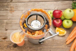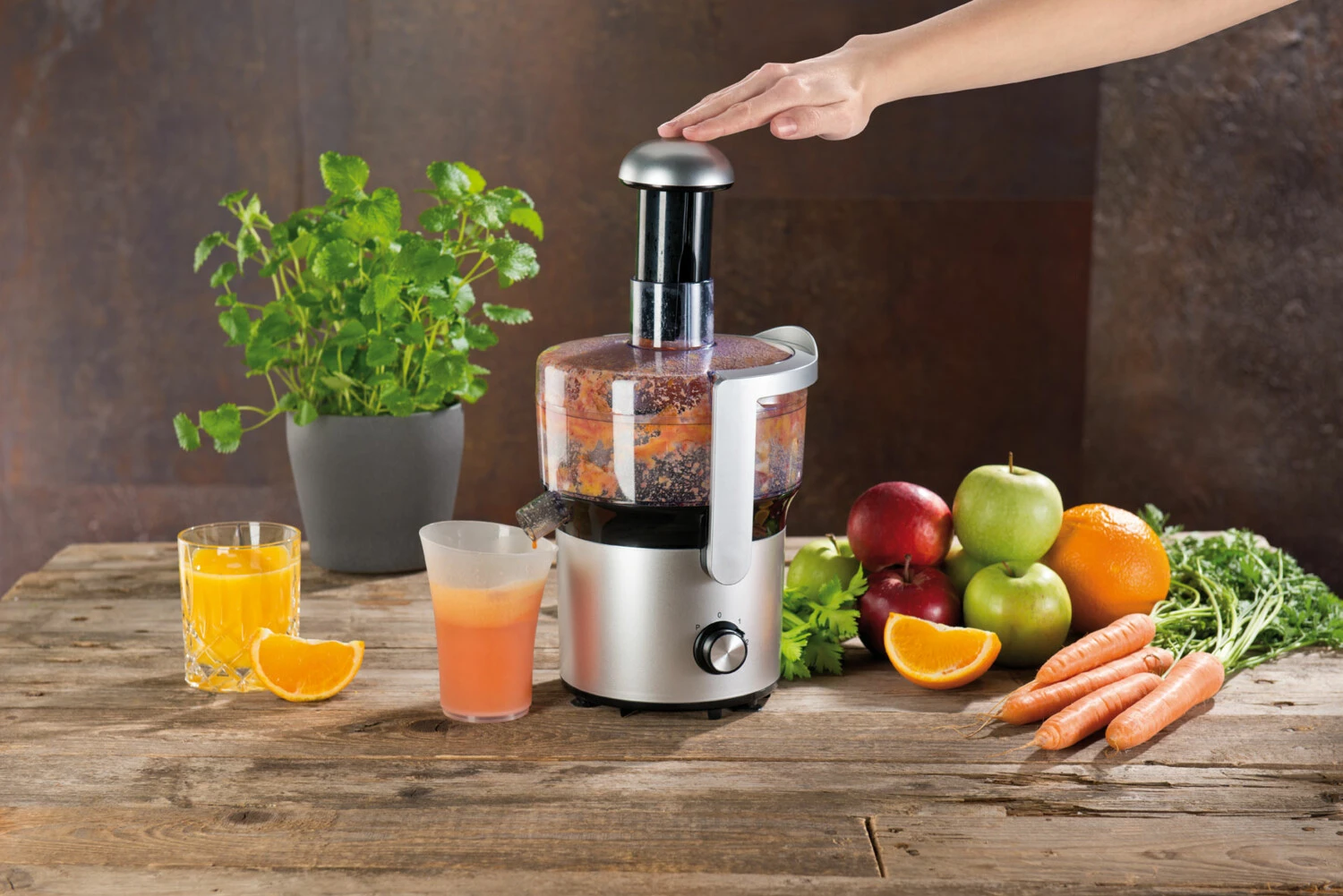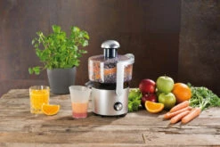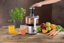 Commencez la journée avec un bon jus de fruits bien frais ! La centrifugeuse extrait rapidement et facilement les fruits et légumes. Grâce à ses deux vitesses de rotation, vous pouvez presser les fruits mous et durs. Le tamis en acier inoxydable fin retient la pulpe, et seul le jus pur et frais finit dans le récipient collecteur !