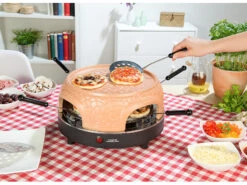 Cette version italienne et originale de la raclette permet à chacun de préparer sa pizza selon ses goûts. La classique au fromage, jambon et poivrons ou la version plus exotique avec du saumon, des crevettes et de l’ananas, ce four convient aux plaisirs les plus variés.