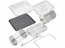 - Inclus: broche, panier rotatif, panier à poisson, plaque de cuisson, outil de préhension, 2 disques, 2 fourchettes, 3 grilles, 6 vis, 8 piques