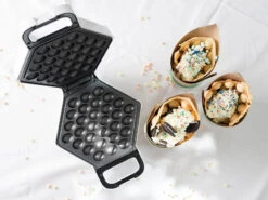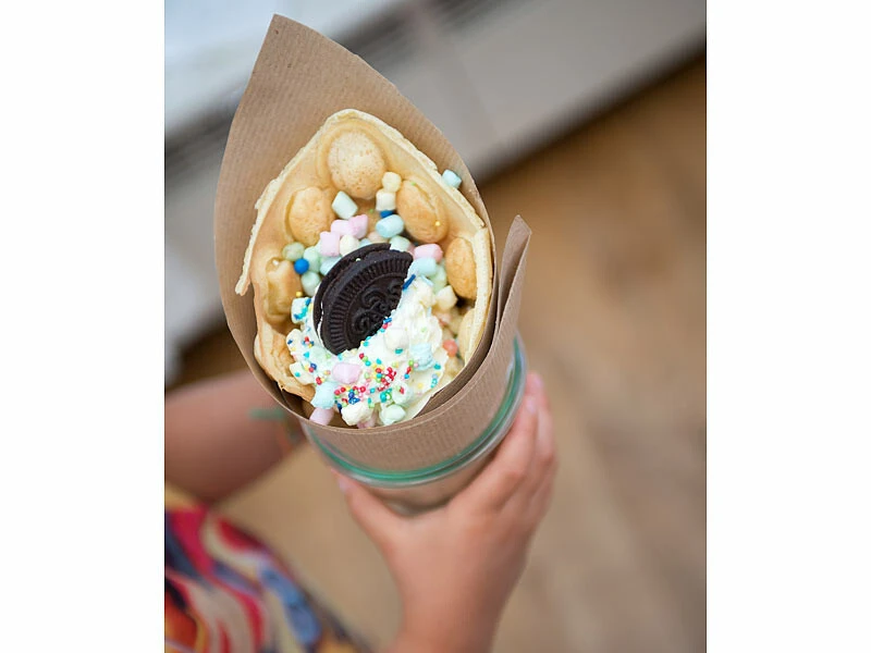 Ces gaufres souples s’enroulent pour accueillir les garnitures les plus gourmandes. Dégustez vos gaufres avec des fruits frais, de la glace ou du chocolat. Elles peuvent également être agrémentées de guimauves colorées, de biscuits, de crème fouettée et de toutes sortes d’autres délices. Vous pouvez aussi essayer une variante salée avec des gaufres au fromage et jambon par exemple. Il n’y a pas de limite à votre créativité !