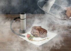 Ce mini fumoir de table permet d’apporter la saveur incomparable du goĂ»t « fumé » Ă la viande, au fromage ou aux lĂ©gumes. L’utilisation est très simple, il suffit de rĂ©partir la fumĂ©e froide sur les aliments grâce au tuyau.