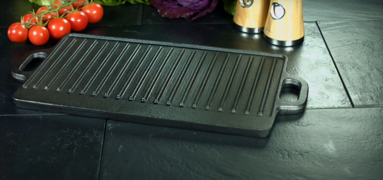 Mais il y a moyen de continuer à profiter du goût grillé tellement unique si on a les bons accessoires de cuisson ! Cette plaque de cuisson en fonte vous permet de retrouver les avantages du gril sur votre moyen de cuisson habituel.