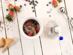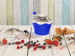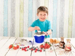 Préparez votre propre crème glacée à partir de vos ingrédients préférés : fruits, chocolat, noix, vous n’avez de limites que votre imagination ! Sortez le récipient de refroidissement du congélateur, versez-y votre préparation et et actionnez la sorbetière ; grâce à la manivelle, vous êtes totalement indépendant du courant électrique ! . Vous pouvez même ajouter des ingrédients en cours de fonctionnement grâce à la cheminée de remplissage. Tournez pendant 10 à 15 minutes, et votre dessert est prêt !
